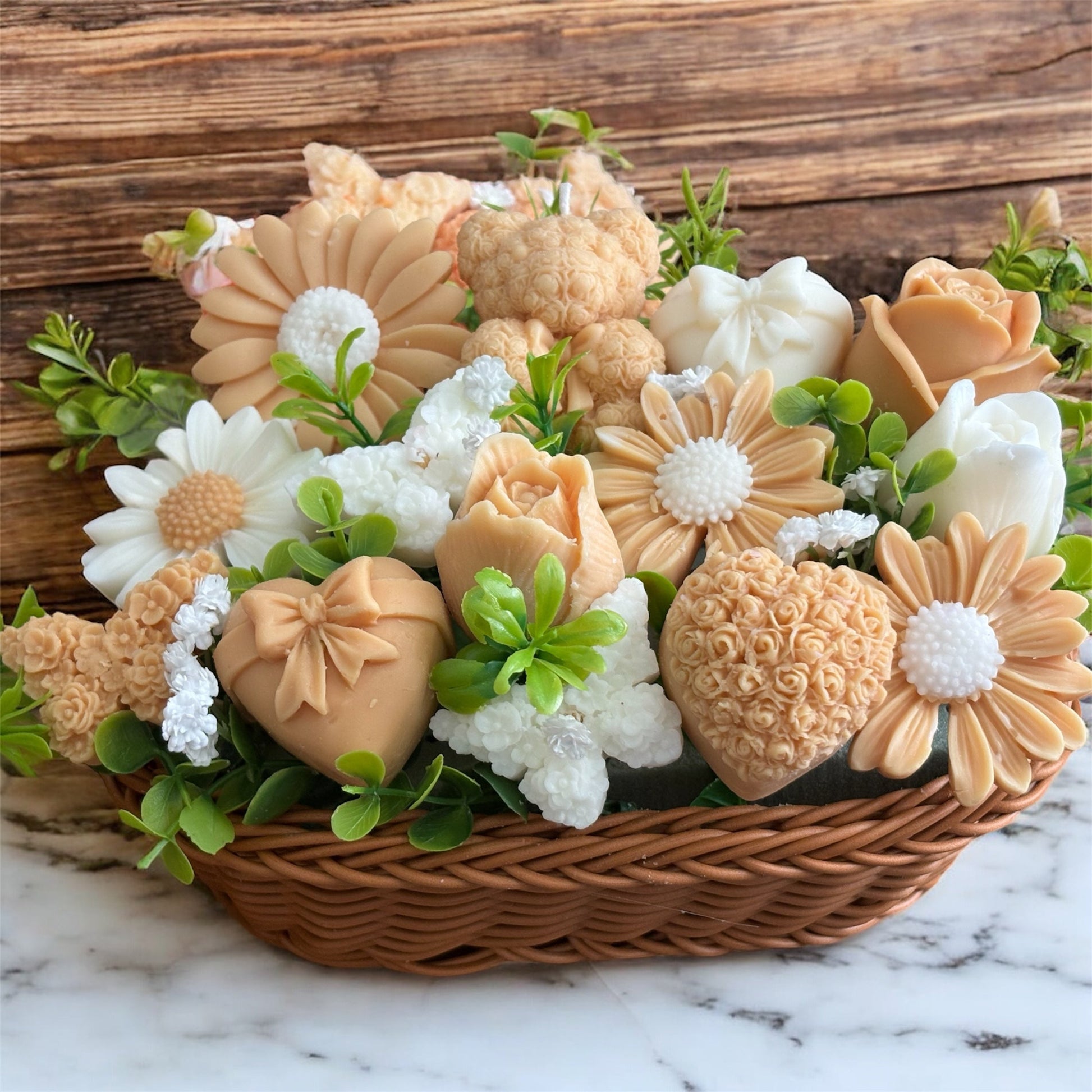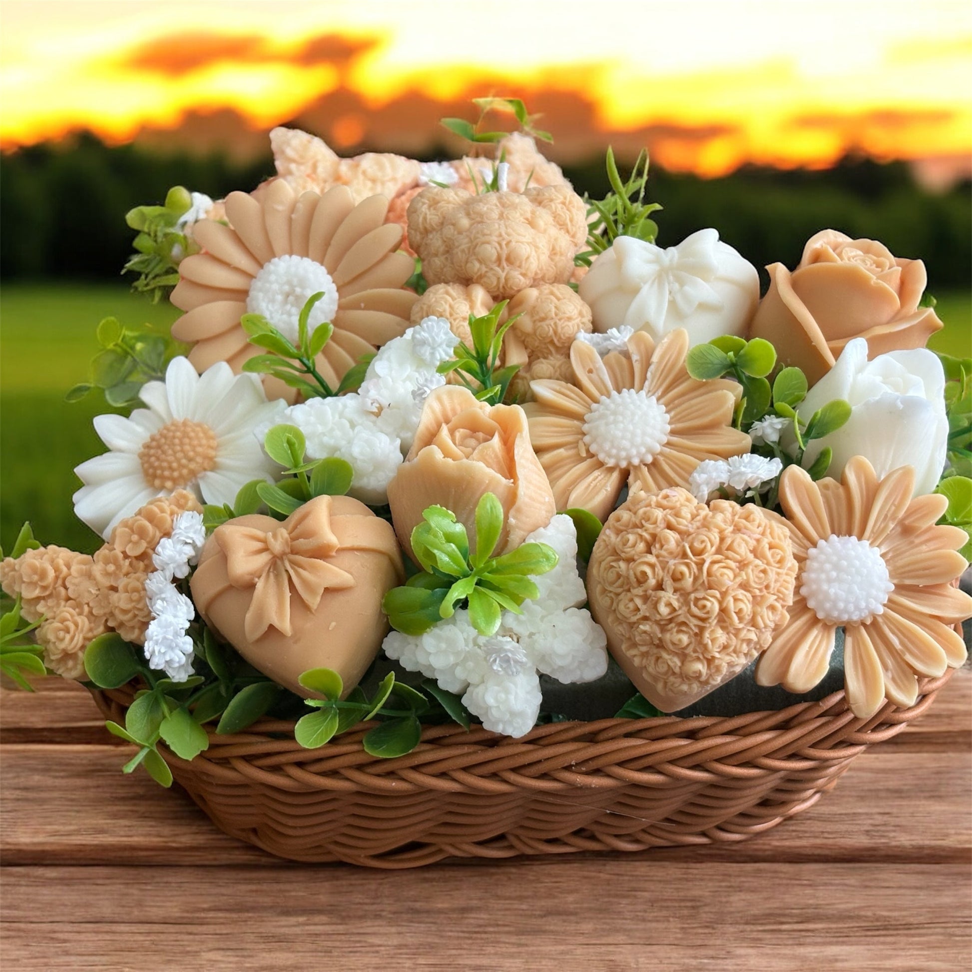 Indulge in the luxurious fragrance of our Bouquet Soy Wax Candles and Wax Melts, elegantly arranged in a gift basket. Made from premium soy wax for a clean, long-lasting burn, these beautifully crafted candles fill your space with enchanting floral scents. Perfect for gifting to loved ones or treating yourself to a spa-like atmosphere at home. Transform any room into a fragrant sanctuary with this ready-to-give collection.  Approximately 12 oz of both candle and wax melts combined