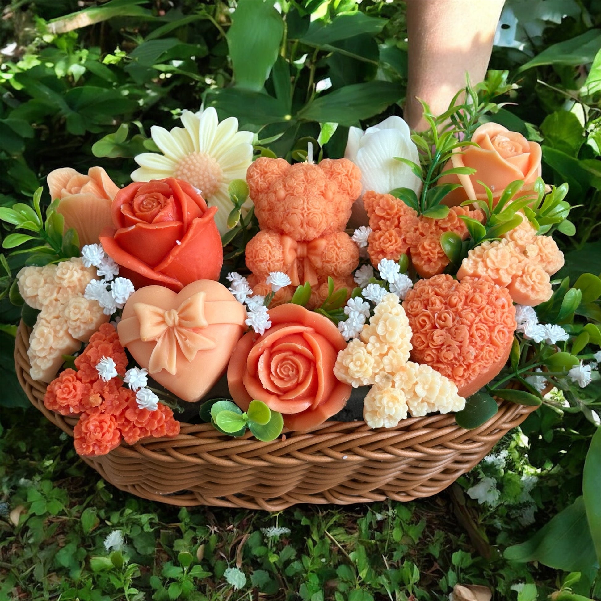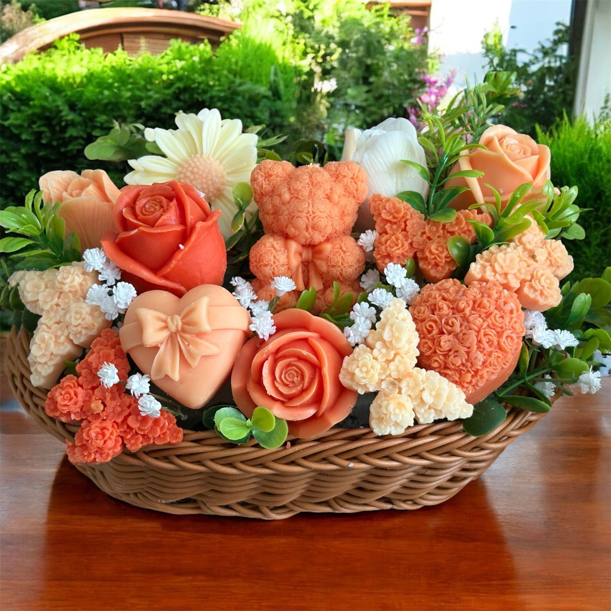 Indulge in the luxurious fragrance of our Bouquet Soy Wax Candles and Wax Melts, elegantly arranged in a gift basket. Made from premium soy wax for a clean, long-lasting burn, these beautifully crafted candles fill your space with enchanting floral scents. Perfect for gifting to loved ones or treating yourself to a spa-like atmosphere at home. Transform any room into a fragrant sanctuary with this ready-to-give collection.  Approximately 12 oz of both candle and wax melts combined