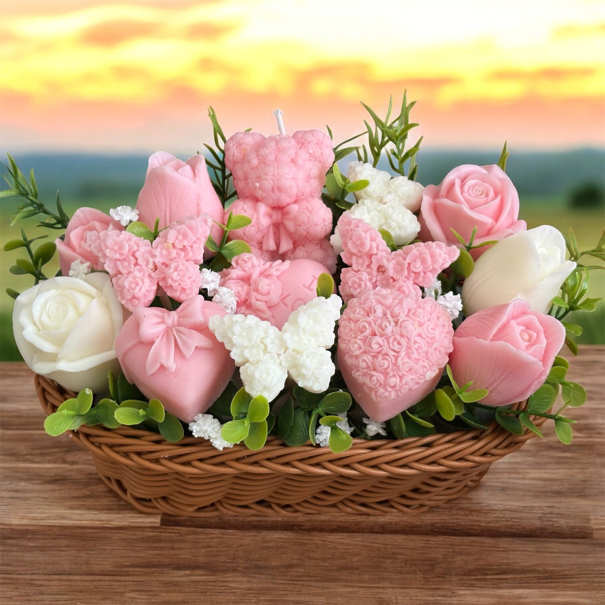 Indulge in the luxurious fragrance of our Bouquet Soy Wax Candles and Wax Melts, elegantly arranged in a gift basket. Made from premium soy wax for a clean, long-lasting burn, these beautifully crafted candles fill your space with enchanting floral scents. Perfect for gifting to loved ones or treating yourself to a spa-like atmosphere at home. Transform any room into a fragrant sanctuary with this ready-to-give collection.  Approximately 12 oz of both candle and wax melts combined