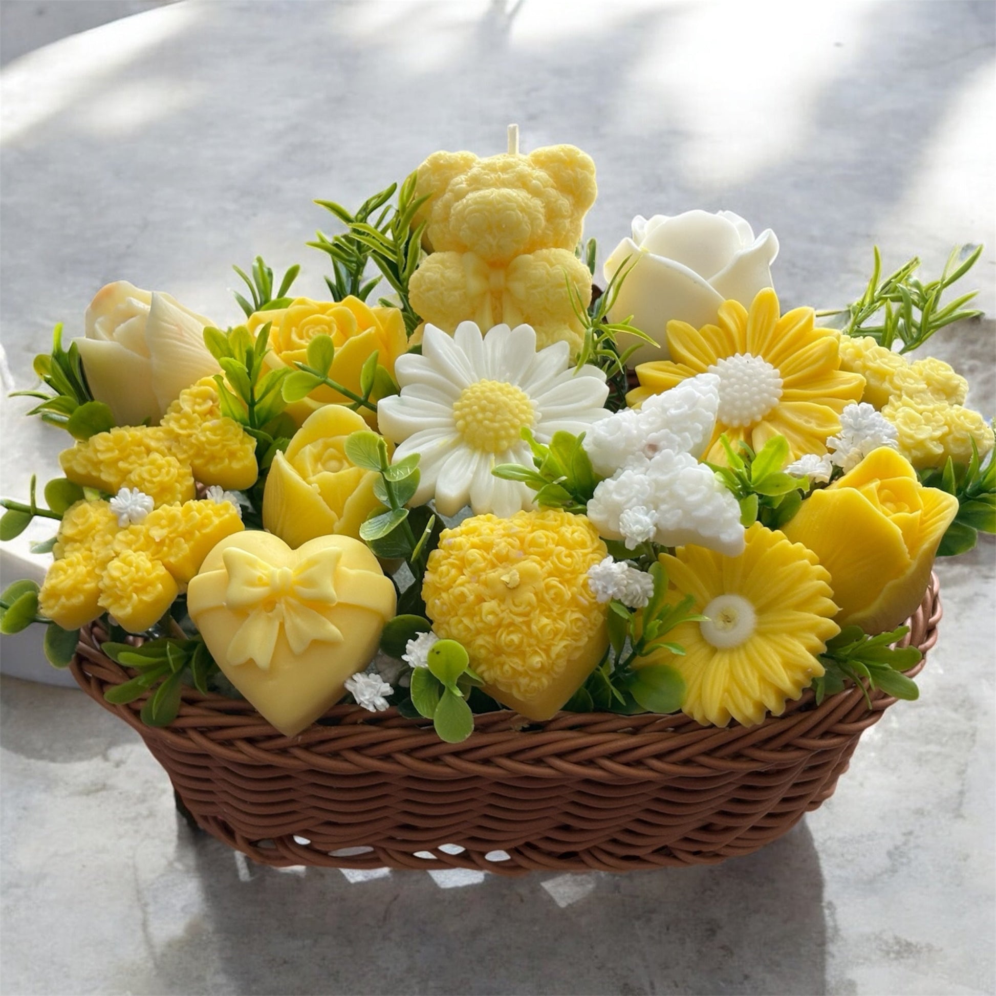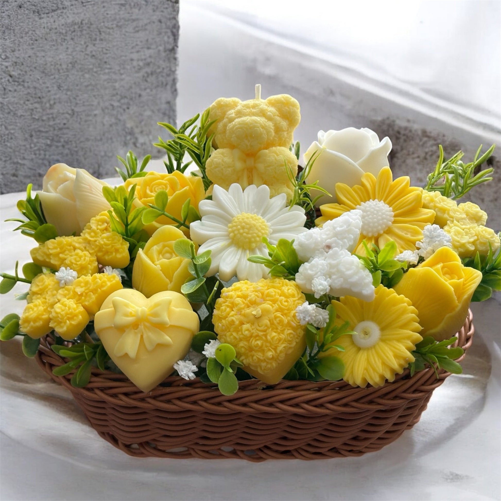 Indulge in the luxurious fragrance of our Bouquet Soy Wax Candles and Wax Melts, elegantly arranged in a gift basket. Made from premium soy wax for a clean, long-lasting burn, these beautifully crafted candles fill your space with enchanting floral scents. Perfect for gifting to loved ones or treating yourself to a spa-like atmosphere at home. Transform any room into a fragrant sanctuary with this ready-to-give collection.  Approximately 12 oz of both candle and wax melts combined