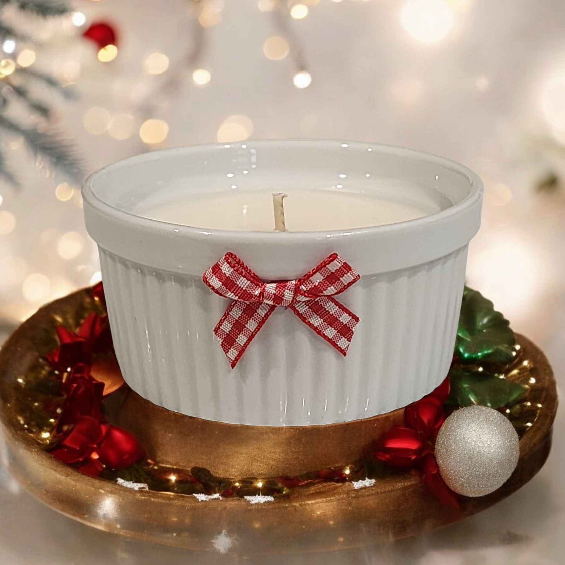 Add a touch of seasonal charm to any space with our 6oz Holiday Ramekin Soy Candle. Hand-poured with all-natural soy wax, this candle comes in a classic ramekin and is adorned with a red gingham ribbon for a cozy, festive accent.