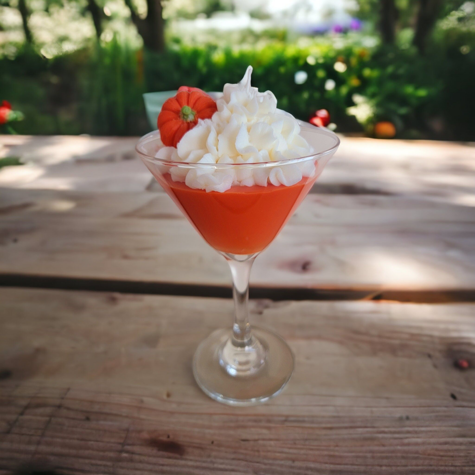 Hand-poured into a 12oz jar with all-natural soy wax, this candle features a whimsical pumpkin-shaped wax melt embed on top for that extra seasonal charm. The scent is a smooth mix of creamy pumpkin, warm spices, and a hint of sweet vanilla — inspired by your favorite fall martini.