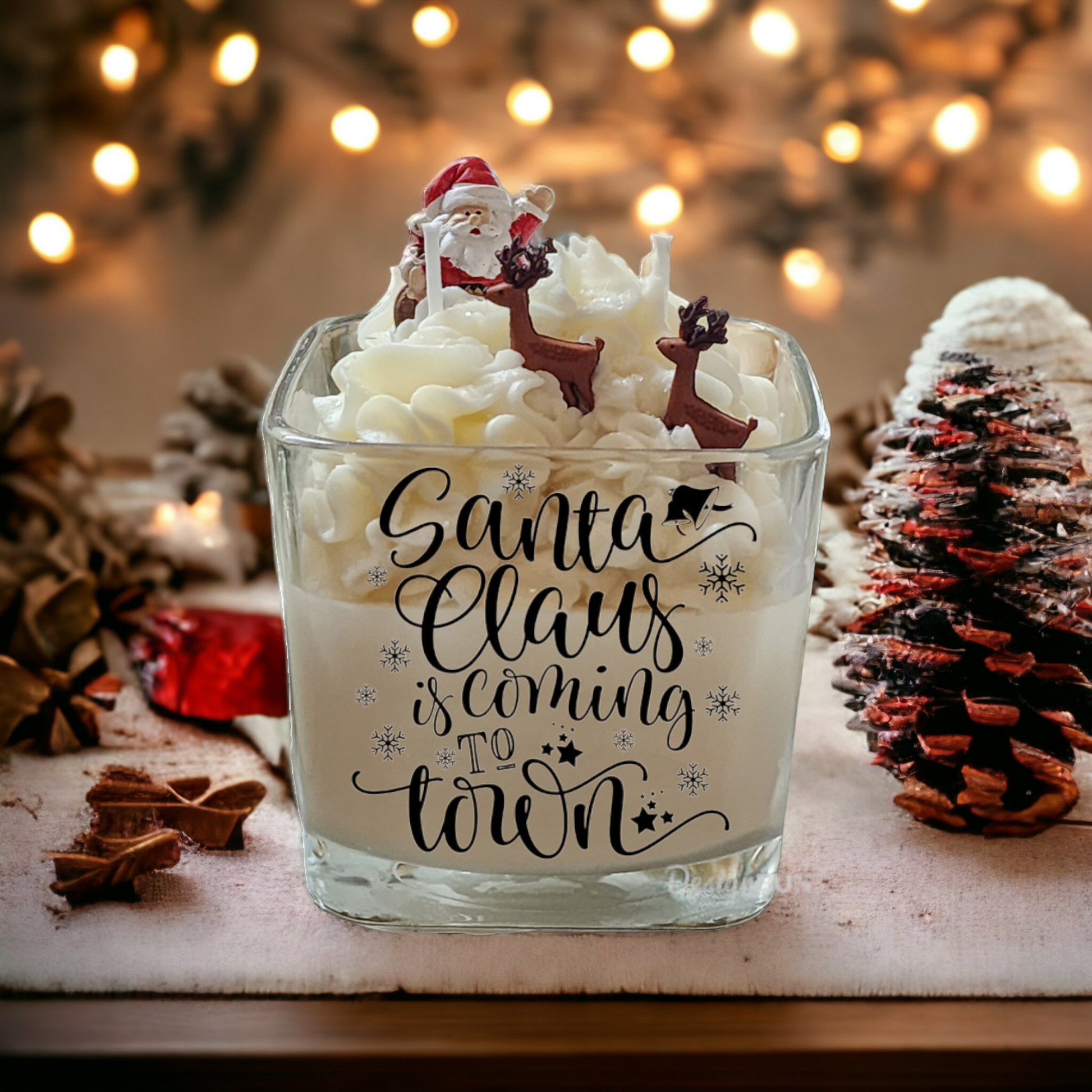 Celebrate the season in style with our Elegant Santa Soy Candle. This 16oz holiday centerpiece is hand-poured with all-natural soy wax and topped with charming Santa and reindeer wax embeds for a festive touch.