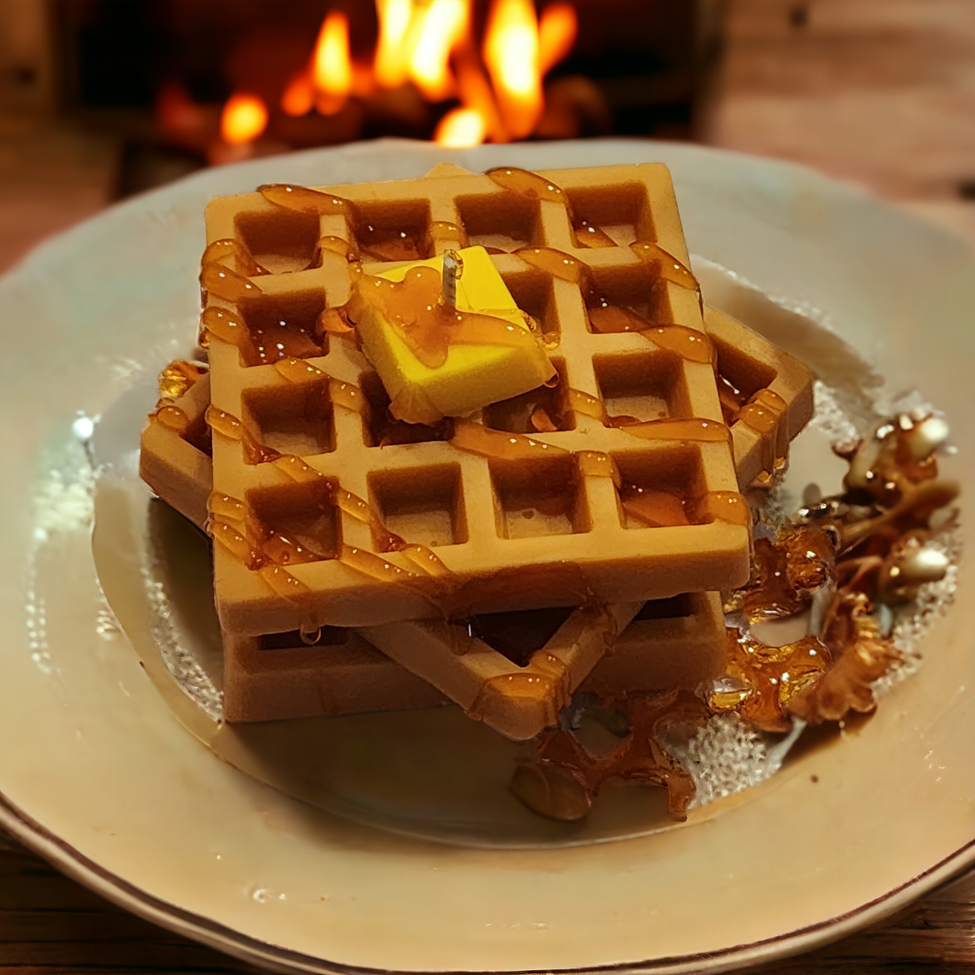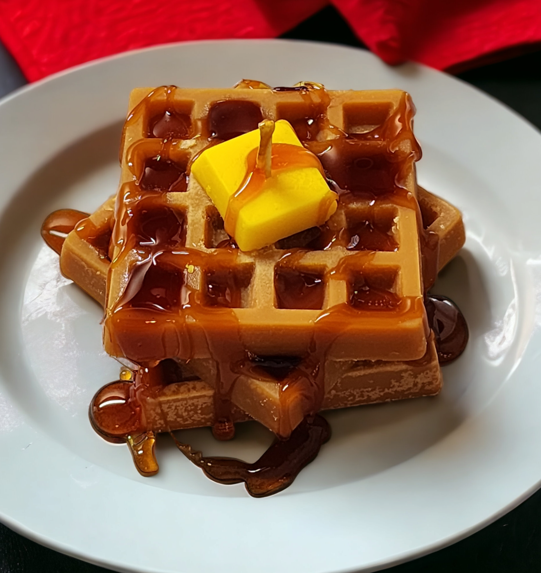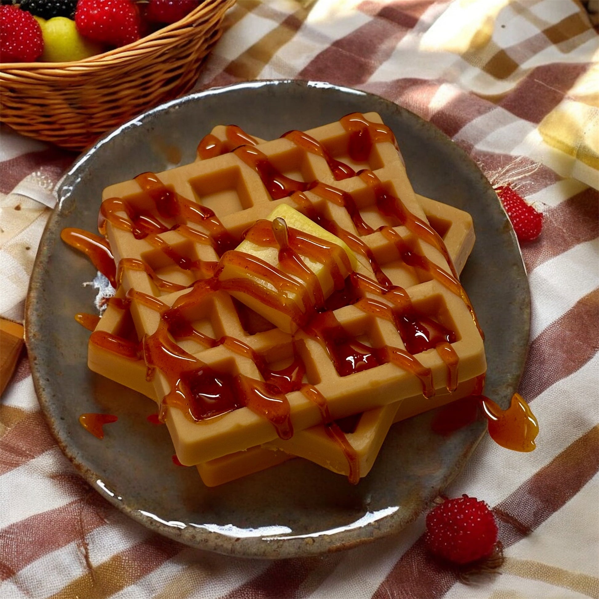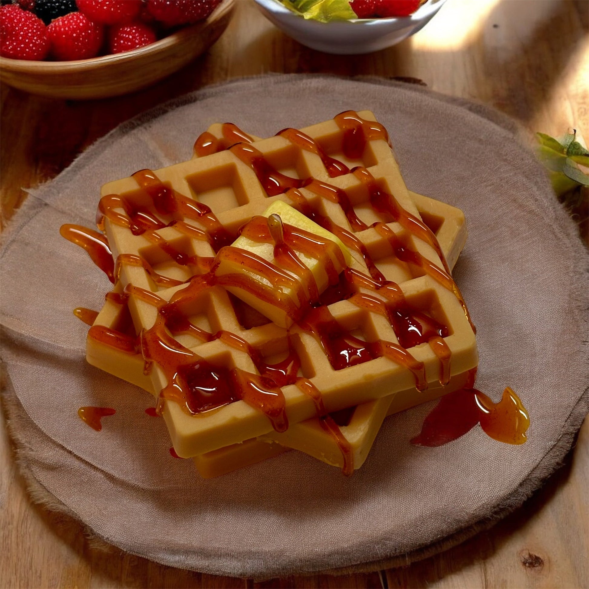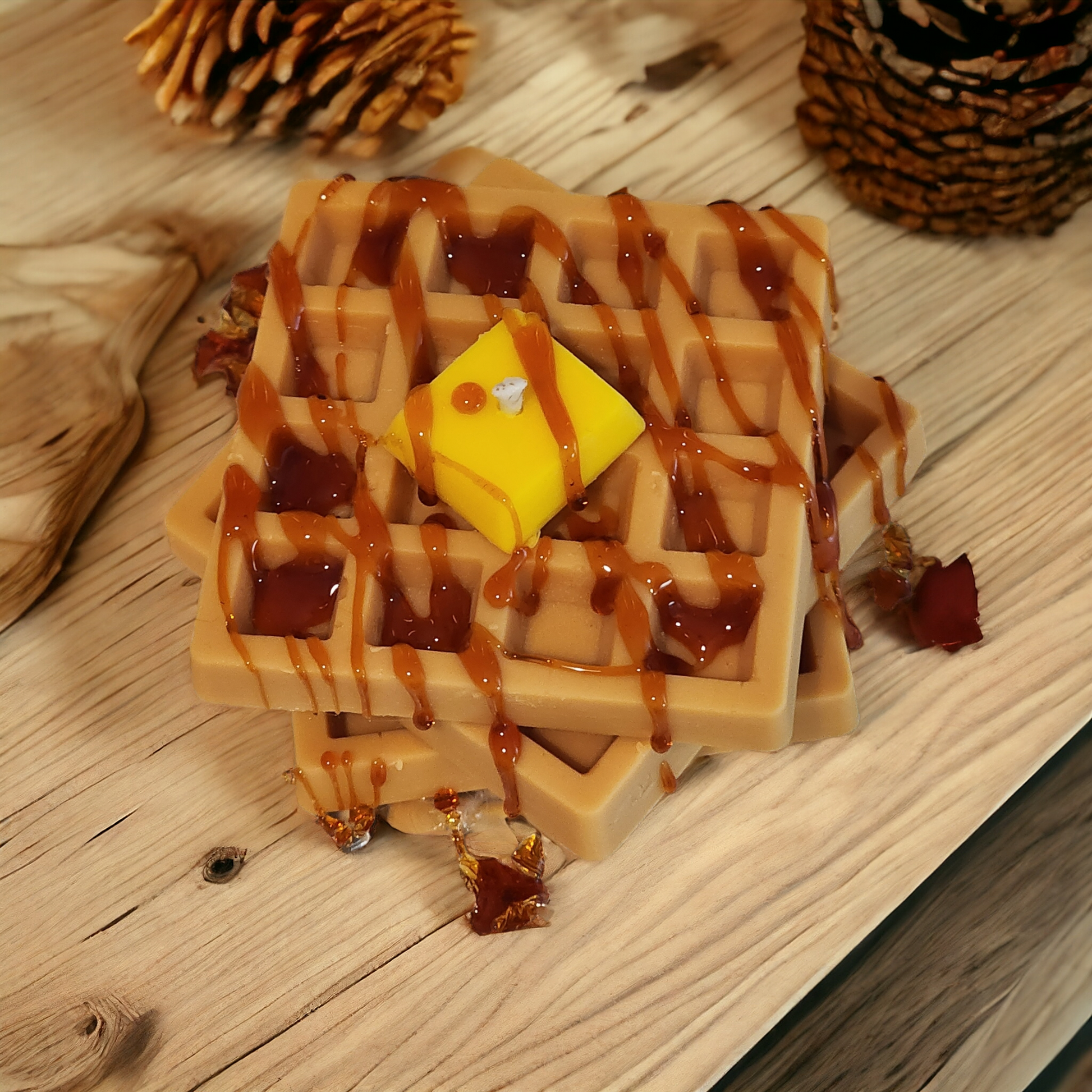 Indulge in the comforting scent of freshly baked waffles with our 5oz aroma infused waffle soy wax candle. Packaged in a themed bakery box with a realistic butter slice wax embed and wax caramelized drizzle, this candle is the perfect addition to your home decor.